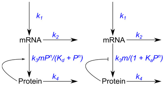 Equation (3) represents instead the case of positive post-transcriptional feedback: