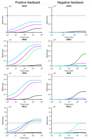 Simulated gene expression with positive/negative translational feedback loops for HEK2, HRB1, SKI2, and NPL3. Positive feedback is indicated to the left, negative feedback to the right. The dashed grey line indicates the experimentally determined (benchmark) protein abundance (Pss, Table 1). Solid black line represents each feedback with Hill coefficient of 1. The solid violet line considers Hill coefficient of 2 with a protein complexing constant of 1 M; the dotted violet line assumes a protein complex formation constant of 1 μM. A Hill coefficient of 4 with protein complexing constant of 1 M is indicated with the solid cyan line, a complexing constant of 1 μM as dotted cyan line. The calculated ‘best-case’ Ka and Kd for HRB1 and NPL3—feedback models where n = 1 are shown in dashed green lines (not shown for HEK2 and SKI2 as these returned negative values, which are not realistic).