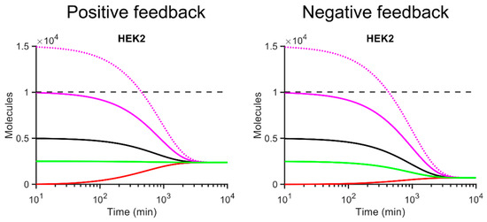 Simulation of autoregulatory gene expression for HEK2 with different starting concentrations. Positive (left) and negative (right) feedback models (n = 1) are parameterised with different initial copy numbers for mRNA (mss) and protein (Pss). Dashed grey line, experimentally determined (benchmark) protein abundance (Pss = 10,000); solid violet line, P0 = Pss and m0 = mss; dashed violet line, P0 = 1.5 (Pss) and m0 = 1.5 (mss); black line P0 = 0.5 (Pss) and m0 = 0.5 (mss). Green line P0 = 0.25 (Pss) and m0 = 0.25 (mss).
