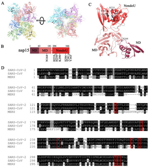 - Guarino, L.A.; Bhardwaj, K.; Dong, W.; Sun, J.; Holzenburg, A.; Kao, C. Mutational analysis of the SARS virus nsp15 endoribonuclease: Identification of residues affecting hexamer formation. J. Mol. Biol. 2005, 353, 1106–1117. [Google Scholar] [CrossRef]