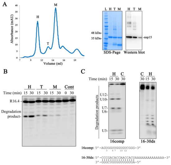 Characterization of SARS-CoV-2 nsp15. (A) Left panel: chromatogram obtained during nsp15 size exclusion chromatography; right panels: SDS-PAGE gel with the purified fractions collected during the SEC and the respective Western blot. M, monomer; T, trimer; H, hexamer; L, Protein ladder. (B) In vitro activity of the purified fractions H, T and M using 50 nM of R16.4 RNA substrate and 500 nM of protein. (C) In vitro activity of nsp15 in the hexamer conformation (500 nM) in the presence of a single-stranded RNA (16comp) and a double-stranded RNA (16–30 ds), which are schematically represented in the bottom. Reactions were analyzed on 7-M urea/20% polyacrylamide gels. C, control reactions; time points are indicated in the top of each panel. All the experiments were performed at least in triplicate.