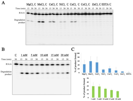 Effect of divalent ions in SARS-CoV-2 nsp15. (A) Five hundred nM of nsp15 were incubated with 50 nM of R16.4 RNA substrate in the presence of 10 mM of different divalent ions. (B) Five hundred nM of nsp15 were incubated with 50 nM of R16.4 RNA substrate in the presence of different MnCl2 concentrations (1–20 mM). Reactions were analyzed on 7 M urea/20% polyacrylamide gels. C, control reactions; time points are indicated in the top of each panel. All the experiments were performed at least in triplicate. (C) Quantification of nsp15 protein activity (% of RNA degradation product generated) in the presence of different divalent ions (on the top) and in a growing range of different MnCl2 concentrations (on the bottom).