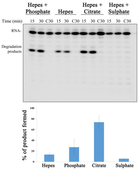 Kim et al. reported that nsp15 was crystallized in the presence of a citrate, which was bound to the protein active site [18]. The citrate was shown to make hydrogen bonds with several key and highly conserved residues found in the nsp15 active site, including H235, H250, K290 and T341 (highlighted in Figure 1D). Moreover, it also forms Van der Waals contacts with Tyr343. All these interactions were postulated to stabilize the residues from the active site, thus ordering the NendoU domain [18]. In another study where the nsp15 structure bound to nucleotides was solved, it was possible to observe the presence of a phosphate ion bound to the active site that also interacted with H235, H250, T341 and K290 residues [31]. It was described that the nsp15 active site is structurally similar to that of RNase A. Sulfate was found to inhibit the ribonucleolytic activity of RNase A [32]. Considering the similarities between both ribonucleases, sulfate could also influence nsp15 activity. In order to determine the role of citrate, phosphate and sulfate over nsp15 activity, we ran activity assays in the presence of these compounds. Our results showed that, in the conditions tested, both phosphate and citrate enhanced nsp15 activity (Figure 4). In contrast, in the presence of sulfate, nsp15 activity was completely blocked (Figure 4). These results indicate that the activity of nsp15 from SARS-CoV-2 is highly influenced by the presence of different chemical groups in the reaction, which can be valuable information when designing compounds to inhibit nsp15 activity.