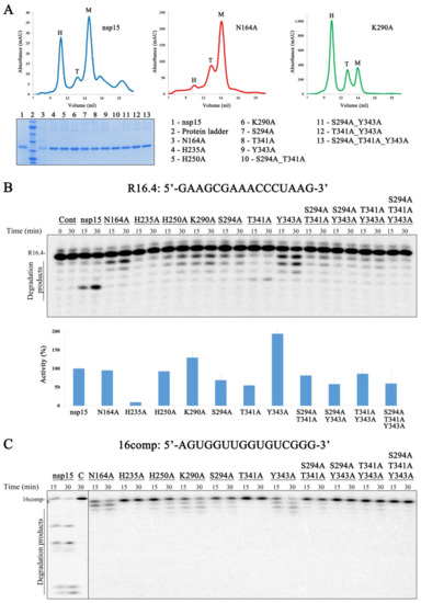 Effect of nsp15 mutations on its endonucleolytic activity. (A) On the top, chromatograms obtained during nsp15 wt, N164A and K290A size exclusion chromatographies; M, monomer; T, trimer; H, hexamer; on the bottom, a SDS-PAGE gel with all hexameric fractions of the purified proteins. (B) On the top, 800 nM of either nsp15 wt or nsp15 mutant versions were incubated with 50 nM of R16.4 RNA substrate; on the bottom, quantification of nsp15 wt and mutants activity in the presence of R16.4 RNA (% of RNA substrate degraded). The activity of nsp15 wt was considered as 100%. (C) 800 nM of nsp15 wt or each mutant version were incubated with 50 nM of 16comp RNA substrate. Reactions were analyzed on 7 M urea/20% polyacrylamide gels. C, control reactions; time points are indicated in the top of each panel. All the experiments were performed at least in triplicate.