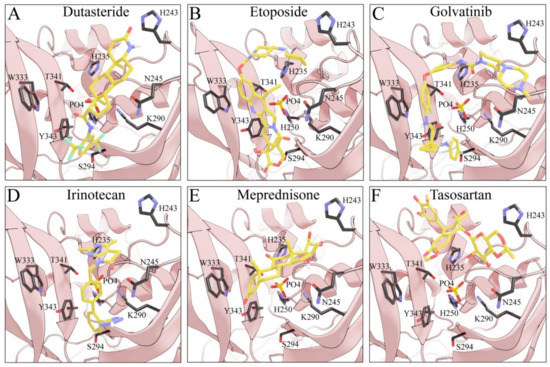 Docking solutions for the six selected drugs (A) Dutasteride, (B) Etoposide, (C) Golvatinib, (D) Irinotecan, (E) Meprednisone and (F) Tasosartan are shown with the carbon atoms in yellow. Key residues of the nsp15 active site are depicted with the carbon atoms in black. The active site and the phosphate ion (PO4) are covered by Dutasteride, Irinotecan, Golvatinib and Tasosartan. Meprednisone and Etoposide bind only to the top portion of the nsp15 active site.
