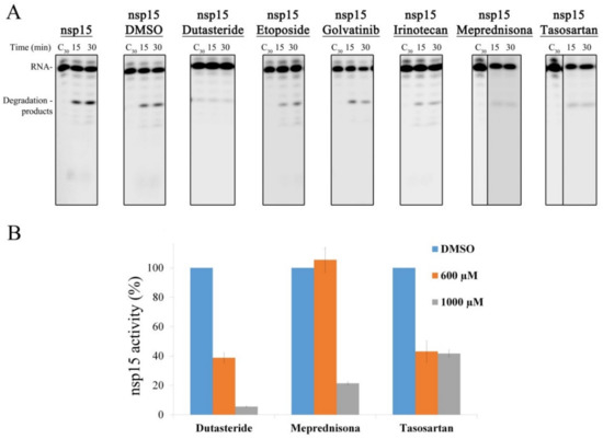 Effect of different drugs in SARS-CoV-2 nsp15 activity. (A) 500 nM of nsp15 were incubated with 50 nM of R16.4 RNA substrate in the presence of 1 mM of each drug indicated on the top of the respective panel. Reactions were analyzed on 7-M urea/20% polyacrylamide gels. C, control reactions; time points are indicated in the top of each panel. All the experiments were performed at least in triplicate. (B) Quantification of nsp15 activity in the presence of different concentrations of Dutasteride, Meprednisone and Tasosartan. The activity of nsp15 in the presence of DMSO was considered 100%.