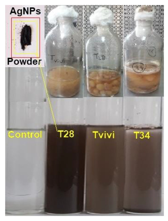 Trichoderma mycelium was produced within the liquid media of three isolates, namely, T28, Tvivi, and T34, in a 1 mM silver nitrate aqueous solution. The amount of brown hue in the sample shows the presence of silver nanoparticles (AgNPs).