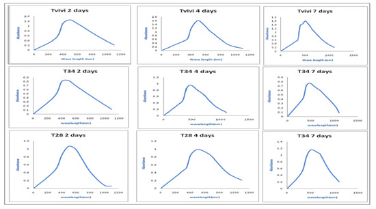 The UV-Vis spectrum of AgNPs generated by Tvivi, T34, and T28 was explored after 2, 4, and 7 days of synthesis.