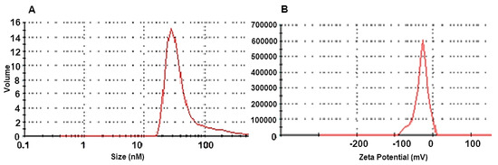 The particle size distribution of AgNPs solution as determined by DLS (Figure 3A) indicated an average particle size of 52.34 nm, PdI: 0.359, and a zeta potential of −25.1 mV (Figure 3B).