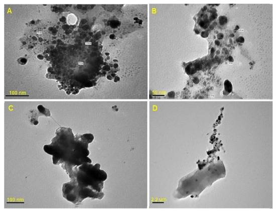 The TEM micrographs of the Tvivi produced silver nanoparticles (AgNPs) show the corresponding particle size distribution and shape. The electron micrographs were acquired at different magnifications A (×200 K), B (×360 K), C (×400 K), and D (×100 K).
