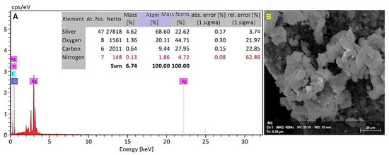 An EDX detector attached to a scanning electron microscope was used to determine the elemental composition of the powdered sample. The EDX investigation showed a strong signal for a silver element at around 3 keV (Figure 6A). The elemental analysis revealed atom (%) information as 68.60% silver, 20.11% oxygen, 9.44% carbon, and 1.86% nitrogen.