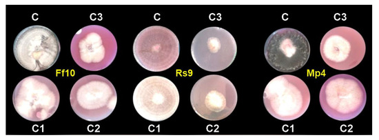 In vitro effect of AgNPs against damping-off pathogens caused by FF10, RS9, and MP4 isolates; (C) control, (C1) 20, (C2) 40 and (C3) 100 µg/mL after 7 days.