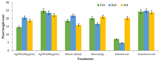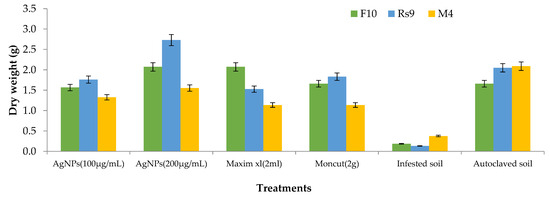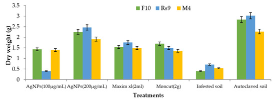 Because there was no interaction between fungus and treatment on plant height and dry weight, the general mean was used to evaluate the means of the different treatments (Figure 10 and Figure 11). All treatments were effective in controlling the disease for plant height. However, the therapy with AgNPs (100 µg/mL) was the least effective, whereas the other treatments were all equally effective. In terms of dry weight, all treatments were efficient in managing the disease, apart from AgNPs (100 µg/mL) (Figure 12), which was ineffective, and AgNPs (200 µg/mL), which was the most effective treatment in terms of dry weight (2.208 g). There was no statistically significant difference in the general means of the fungi that were tested.