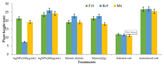 Effects of fungus, treatments, and their interactions on the plant height of Giza90 cotton seedlings cultivated in contaminated soil in a greenhouse. LSD (p ≤ 0.05) for fungus × treatment = 5.74.