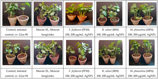 Uncoated cotton seeds sown in sterilized soil infested with three fungal pathogens, namely, F. fujikuroi, R. solani, and M. phaseolina as a negative control, uncoated cotton seeds sowed in sterilized soil as a positive control, treated with two fungicides (Maxim XL and Moncut) sowed in infested soil and coated with AgNPs (100, 200 µg/mL) in infested soil. The photo was obtained after 45 days of typical growth in a greenhouse.