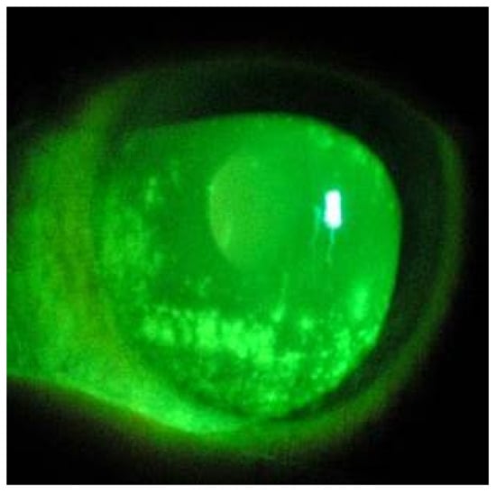 We assume that the high frequency of ocular involvement could be linked to direct contamination by the use of respiratory facial devices; the eyes of the two patients who had not used face masks were not positive for the virus. In patients 2–4, 8 and 9, hyperemia was detected in both eyes with a higher degree in the eye with epithelial defects. These differences are probably related to a different degree of viral exposure of the ocular surface and to different basic conditions, such as dry eye phenomena or pre-existing or concomitant corneal traumatic micro-lesions []. The same reasons can explain the presence of one positive eye and the other negative in patient n. 8; otherwise, this result could be due also to a false-negative test for low viral load.