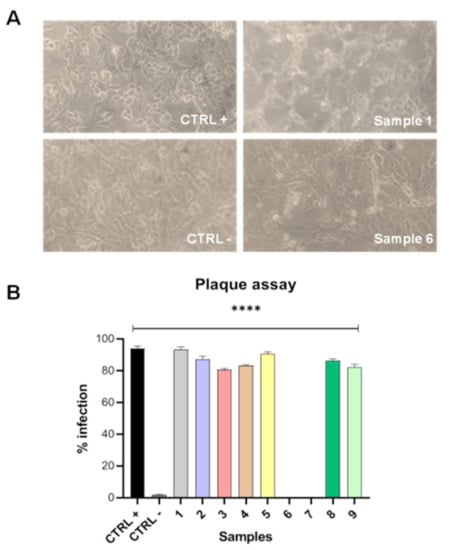 Each of the nine samples was inoculated on Vero cells and the potential cytopathic effect (CPE) was evaluated after 48 h. Then the supernatant was collected and titrated on the cell monolayer overlaid with 3% carboxymethylcellulose. After 2 days post-infection, cells were fixed with 4% formaldehyde, stained with 0.5% crystal-violet, and viral plaques were counted. The percentage of infection was calculated with respect to the positive control (CTRL+) consisting of Vero cells infected with SARS-CoV-2.