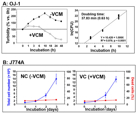 The DMEM-based growth medium was used for both J774A and OJ-1. The doubling time of OJ-1 in exponential growth was 37.83 min (0.63 h) (Figure 1A). The effects of VCM at a concentration of 48 μg/mL were examined on OJ-1 and J774A. VCM had a severe bactericidal effect on OJ-1 during 48 h of incubation (Figure 1A) but induced no cytotoxic and growth inhibitory effects on J774A during the 3 days of incubation (Figure 1B).