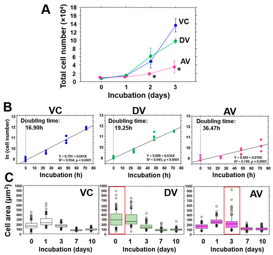 Proliferation of J774A cells after ingesting OJ-1 and cell area. (A) Time courses of the proliferation activity of J774A cells incubated in 10% FBS containing DMEM with VCM without using OJ-1 (VC group) and with ethanol pretreated dead OJ-1 (DV group) and living OJ-1 (AV group). Data: mean ± S.D. *: p < 0.05 vs. VC group. (B) The doubling times in the VC, DV, and AV groups are shown using their initial exponential growths. (C) The cell size was measured during 10 days of incubation. Data are shown in a box-and-whisker plot. Note, data deviation is more pronounced on day 0 in the DV group but on day 3 in the AV group.