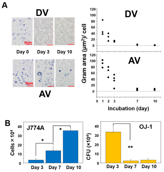 The intracellular Gram-positive bacteria area was morphometrically analyzed in the DV and AV groups during 10 days of incubation. On the base of the Gram-positive area per cell, the calculated decay curve in the AV group revealed a similar pattern to that in the DV group (Figure 3A). However, intracellular dense bacterial accumulation in some cells was detected until day 10 in the AV group as compared to the DV group (Figure 3A). In the AV group, when the J774A cell density and CFU of OJ-1 were analyzed on days 3, 7, and 10, the J774A cell number linearly increased over time (Figure 3B, left), although the number of living OJ-1 shown by CFU value significantly decreased on days 7 and 10 as compared to day 3 (Figure 3B, right). Meanwhile, no significant change was found between day 7 and day 10. On the other hand, no living OJ-1 was found at any time points in the DV group.