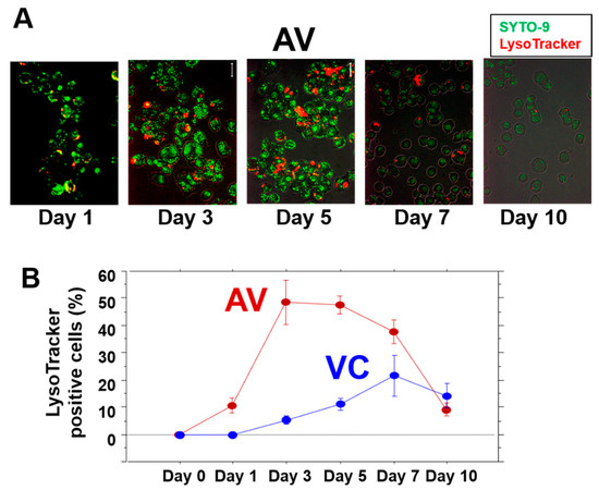 The distributions of the intracellular OJ-1 and active lysosomes were analyzed using SYTO-9 and LysoTracker, respectively. The mutual appearance of OJ-1 and LysoTracker-positive lysosomes was analyzed in the AV group (Figure 4A). In the VC group, LysoTracker-positive lysosomes were initially not detected in the cells, but such cell numbers slightly increased after prolonged incubations (Figure 4B). On the other hand, in the AV group, LysoTracker-positive cells increased up to 50% during days 3 and 5 and were also associated with an increase in size (Figure 4B). However, LysoTracker-positive cells subsequently reduced drastically on days 7 and 10.