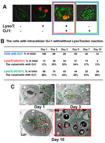 3.6. Appearance of LysoTracker-Positive Cells with Intracellular OJ-1