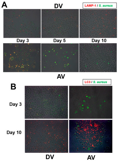 We also analyzed the lysosome expression process in J774A cells. In the control VC group, lysosome expression slightly increased during the incubation time. This detected increase can be a result of macrophage response to the cell debris produced in the over-confluent cultures in a 24-well plate. Thus, such lysosomal activation visualized by LysoTracker might be a natural cellular reaction when cultured in a narrow well. On the other hand, in the AV group, LysoTracker-positive cell numbers drastically increased during days 3 and 5 of the study. Such increased lysosome expression can be a response to the phagocytosed OJ-1. The cell state during the initial 5 days of the study could be for an intracellular processing phase for the phagocytosed OJ-1, in which they may work for eradication of the ingested bacteria in the cells. This decrease was also noted in the study using LAMP-1-positive lysosomes. As a result of the robust bacterial eradication process, the intracellular morphometrical bacterial number and living bacteria number shown by CFU drastically decreased after day 7 of the study, and the cells entered a stable state on days 7 and 10. Intracellular OJ-1 out of the LAMP-1-positive lysosomes increased over time. Moreover, our results showed that intracellular OJ-1 could escape from the LC3-positive autophagy elimination mechanism on day 10 in the AV group. Geng et al. (2020) have recently reported that S. aureus could escape autophagic degradation by inhibiting autophagy flux in epithelial cells [9]. It is, thus, possible that cytoplasmic OJ-1 may also escape from the autophagy as another elimination mechanism.