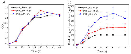 The effects of initial nitrogen concentrations on the growth and nitrogen removal of TN-10. Cells were cultivated in mediums with initial (NH4)2SO4 concentrations of 0.5, 2.5, and 5 g/L. (a) The change in OD600 over time; (b) the degradation of nitrogen over time.