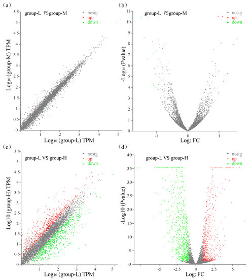 Scatter plots and volcano plots of DEGs that were identified. Green dots: down-regulated DEGs; red dots: up-regulated DEGs; gray dots: unchanged genes. (a) Scatter plot of DEGs compared between group-L and group-M; (b) volcano plot of DEGs compared between group-L and group-M; (c) scatter plot of DEGs compared between group-L and group-H; (d) volcano plot of DEGs compared between group-L and group-H.