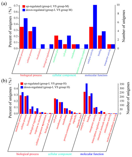 GO functional enrichment of DEGs. The X-axis represents the function of various genes. The Y-axis on the left represents the percent of genes. The Y-axis on the right corresponds to the number of DEGs. (a) DEG comparison between group-L and group-M; (b) DEG comparison between group-L and group-H.