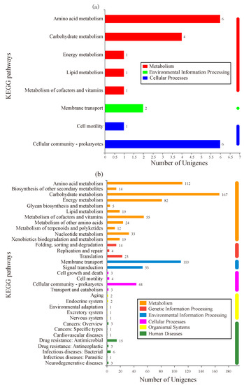 KEGG is a database used to analyze the enriched metabolic pathways of DEGs [16]. As shown in Figure 4a, 16 DEGs in group-M were assigned to 13 known pathways, which were divided into three categories: metabolism, environmental information processing, and cellular processes. Within the metabolism category, six DEGs (gene2714, sad; gene0845, gcvp; gene4851, hpaD; gene4852, hpaF; gene3316, astD; and gene3314, astE) participated in amino acid metabolism. In the cellular processes category, the most abundant subcategory, cellular community-prokaryotes, was involved in six DEGs (gene1826; gene0651, IsrK; gene0656, IsrB; gene1827; gene1824; and gene1825).