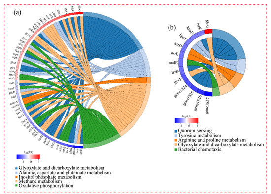 Figure 5 shows the significantly enriched KEGG pathways of DEGs. Due to the involvement of DEGs in group-H in many pathways, only five of the most-enriched function pathways are presented in the figure. As shown in Figure 5a, the five enriched pathways of DEGs under high ammonia nitrogen stress were: inositol phosphate metabolism; phosphotransferase system; oxidative phosphorylation; fatty acid degradation; and valine, leucine, and isoleucine degradation. In group-M, the main enriched pathways were quorum sensing, tyrosine metabolism, arginine and proline metabolism, glyoxylate and dicarboxylate metabolism, and bacterial chemotaxis. The left portion of the circle diagram corresponding to the function pathways represents the most-enriched pathways and the changed magnitude in the levels of the DEGs.