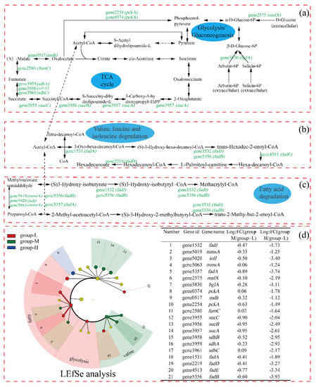 The effect of nitrogen stress on the expressions of genes involved in the TCA cycle: glycolysis (a); valine, leucine, and isoleucine degradation (b); and fatty acid degradation (c). Genes with up-regulated and down-regulated DEGs are presented in red and green, respectively. LEfSe was used to analyze the DEGs involved in the above pathways (d).