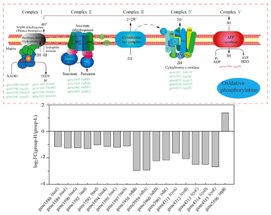 Figure 7 shows the effects of ammonia nitrogen stress on the expression of genes involved in oxidative phosphorylation. As is shown in Figure 7, almost all the DEGs were down-regulated. Genes related to encoding NADH dehydrogenase 1588–1597 (nuo) were down-regulated by LFC 1.02–1.26. Genes 3958–3961 (sdh, encode succinate dehydrogenase) were down-regulated by LFC 2.23–2.95. Additionally, genes 4311–4315 (cyt, encode cytochrome c oxidase) were down-regulated by LFC 1.65–2.67. Oxidative phosphorylation is a primary way to provide ATP through the respiratory chain [23]. The results showed that ammonia nitrogen in high concentrations suppressed the process of oxidative phosphorylation in cells. Finally, when combining the process of glycolysis, the TCA cycle, and oxidative phosphorylation, the activities supporting energy were suppressed, which may be ascribed to the toxicity of high-concentration ammonia nitrogen on cells.