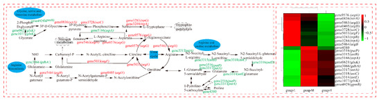 The effect of nitrogen stress on amino acid metabolism. The heatmap on the right shows the expression of the DEGs in the three groups, individually.