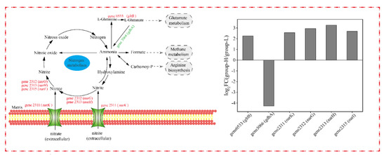 The nitrogen metabolism of cells under ammonia nitrogen stress was analyzed, and the DEGs related to the nitrogen cycle are shown in Figure 9. Since the genes in group-M did not express differentially, only the DEGs in group-H are presented in the nitrogen cycle. As shown in Figure 9, gene0533 (gltB, encodes glutamate synthase) was up-regulated by LFC 2.25. It was reported that gltB participates in ammonia assimilation and regulation [30]. Differing from our results, the gltB in Haloarcula hispanica was induced in a nitrogen-limited medium [18]. Additionally, the genes involved in nitrification pathways were not differentially expressed, and some DEGs were up-regulated in the denitrification pathways. Gene2312 (narG, codes for nitrate reductase subunit alpha), gene2313 (narH, codes for nitrate reductase subunit beta), and gene2315 (narI, codes for respiratory nitrate reductase subunit gamma) were up-regulated by LFC 2.95, 3.26, and 2.69, respectively. The nitrate reductase encoded by narG and narH is the key enzyme in nitrate-respiring [31], and the accelerated denitrification pathways in the TN-10 strain led to a higher degradation of ammonia nitrogen. Meanwhile, gene2311 (narK, codes major facilitator superfamily transporter and relates to nitrate/nitrite transmembrane transporter activity) was up-regulated by LFC 2.57 [32]. The up-regulation of narK in group-H accelerated the entry of ammonia nitrogen into the intracellular region and expedited the utilization of ammonia nitrogen indirectly. The increase in ammonia nitrogen degradation in group-H may be ascribed to increased transmembrane transporters and accelerated denitrification pathways.