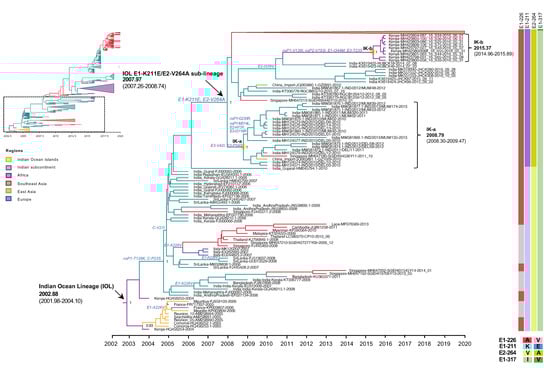 To understand the diversity and evolution of the current IOL sub-lineage E1-K211E/E2-V264A, IOL sequences with these mutations were collected in the Virus Pathogen Resource (ViPR; https://www.viprbrc.org) (accessed on 1 August 2021) []. In addition, nearly whole genome sequences of Maldives CHIKV collected during the outbreak in 2019 [] and those of Bangkok CHIKV in 2020 were determined, and then phylogenetic and molecular clock analyses were performed. In this paper, it is shown that IOL sub-lineage E1-K211E/E2-V264A emerged around 2008, likely in India, and caused sporadic outbreaks in India in 2010 and Kenya in 2016. After this, the IOL sub-lineage acquired an additional mutation of an isoleucine-to-valine mutation within E1 (E1-I317V), and it spread widely to several regions, including the Indian subcontinent, Eastern Africa, and Southeast Asia during 2014–2020.