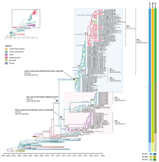 The expansion of the IOL sub-lineage E1-K211E/E2-V264A was observed in recent outbreaks after 2015. This new IOL sub-lineage India and Pakistan strains circulating in 2016 spread rapidly to Bangladesh in 2017 and from Bangladesh to Myanmar, Thailand, and China in 2018–2020. Moreover, this IOL sub-lineage also spread from India to the Maldives and Kenya, Sudan, and Djibouti in 2014–2019. In Figure 3, the phylogenetic analyses show that those sequences were clustered to a monophyletic clade at a posterior probability support of 1 and shared the tMRCA at 2012.12, with a substitution rate of 1.22 × 10−3 substitutions/site/year (s/s/y). Besides the mutations E1-K211E/E2-V264A, this clade shared an additional amino acid substitution of E1-I317V specific to the recent IOL 2014-2020. The phylogenetic tree in Figure 3 show that IOL sub-lineage E1-K211E/E2-V264A with E1-I317V independently evolved into two major phylogenetic clades corresponding to different geographical regions, including the Indian subcontinent/Eastern African clade (IE clade) and the Indian subcontinent/Southeast Asia clade (IS clade), which were arbitrarily named according to the virus-circulating regions.