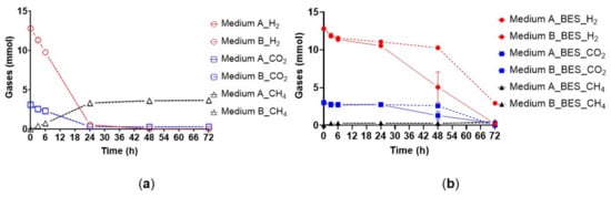 The gas phase for the inhibited and non-inhibited anaerobic granules in batch cultures with medium A and B. The bottles were pressurized solely with H2 (80%) and CO2 at ~2.2 bar during one batch cycle. All experiments were conducted in 200-mL serum bottles with 50 mL working volume. The error bars depict the standard deviation of the mean of n = 3 for non-inhibited cultures and n = 5 for inhibited cultures. When not visible the error bars are smaller than the symbol. Open symbols of panel (a) show non-inhibited cultures and filled symbols of panel (b) show BES-amended cultures with the following description: solid line (medium A), dashed line (medium B), circle (H2), square (CO2), and triangle (CH4).