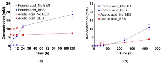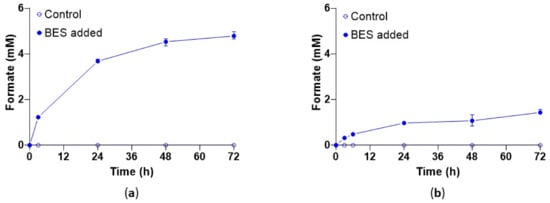 In medium A in presence of BES and H2/CO2, formate concentration increased linearly up to 11.76 ± 0.71 mM after 24 h of incubation and further to 18.57 ± 1.68 mM after 120 h (Figure 3a). In medium A1 and in the presence of BES, formate started to be produced after 240 h of incubation (3.31 ± 1 mM) but acetate was detected after 48 h (0.42 ± 0.025 mM) (Figure 3b). Formate was also produced without BES, and after 72 h the maximum concentration was 0.89 ± 0.14 mM. Similarly, acetate accumulated in the non-inhibited cultures up to 2.7 ± 0.2 mM after 72 h (Figure 3b). It is noteworthy that when BES was added, the formate production rate was 0.47 mM h−1 (R2 = 0.975) and 0.03 mM h−1 (R2 = 0.966) in medium A and A1, respectively. The cultures in medium A produced remarkably more formate and in less time than in medium A1.