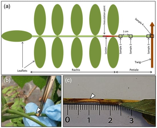 A brown necrotic tissue zone appeared around the site of inoculation (Figure 1c), and after 16 weeks of incubation, the necrotic tissue extended 4 to 38 mm towards the petiole base from the site of inoculation (Figure 2a and Table 1).