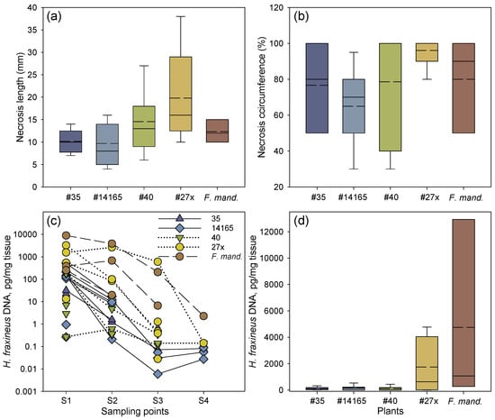Necrosis development and amount of H. fraxineus DNA after rachis inoculation. (a) Proximal length of necrosis from the inoculation site. (b) Relative necrosis circumference (%) at the inoculation site. The median values for clone 40 and 27x coincide with a necrosis circumference of 100%. (c) H. fraxineus DNA at each of the four sampling points in inoculated rachises of common ash clones less susceptible to shoot dieback (35 and 14165) or susceptible to shoot dieback (27x and 40), and one clone of Manchurian ash (F. mand., clone 1989-0059-4). Samples connected by a line represent the same inoculated rachis. Samples not connected by a line represent petioles, where H. fraxineus DNA was not detected in all of the sampling points. Sampling points are as follows: S1, at the border of the necrosis; S2, 1 cm away from the first sample towards the petiole base; S3, petiole base; and S4, petiole–twig junction. (d) Overall mean of H. fraxineus DNA per rachis across the four sampling points in each common ash and Manchurian ash clone. Samples size: 35, n = 6; 40, n = 7; 14165, n = 7; 27x, n = 5; 1989-0095-4, n = 3. For box plots (a,b,d), mean (dashed lines) and median values (solid lines) are shown, as well as whiskers representing the minimum and maximum values, and boxes for the 25% and 75% percentiles.