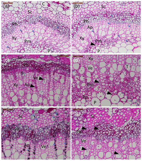Transverse sections of petioles from the lesion border of inoculated rachis samples compared to healthy tissue. (a–e) Common ash clones; (f) Manchurian ash clone. (a) Healthy clone 35. (b) Infected clone 35. (c) Infected clone 27x; note the phloem with less amount of starch and presence of large amounts of hyphae and phenolics. (d) Infected clone 27x; note the abundant presence of mostly axially orientated hyphae in the perimedullary pith. (e) Infected clone 14165 with a large amount of starch grains filling the cortex parenchyma, phloem, and axial parenchyma aligning vessels. (f) Infected Manchurian ash clone 1989-0095-4 with a low amount of starch and the presence of axially and occasionally laterally orientated hyphae. All tissue sections were stained with PAS carbohydrate specific staining. C: cortex; Ph: phloem; Xy: xylem; P: pith; Sc: sclerenchyma; Pm: perimedullary parenchyma; Pp: polyphenolics; T: tylosis; Ap: axial parenchyma; Ve: vessel elements; small blue arrows: starch grains; arrowheads: fungal hyphae. Scale bars: (a–f), 50 µm.