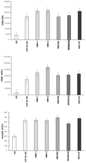 The cytofluorimetric analysis of CD83, CD86 and HLA-DR expression on DCs showed that all Kp strains induced a robust expression of CD83 and CD86 determinants on the membranes of DCs (Figure 1).