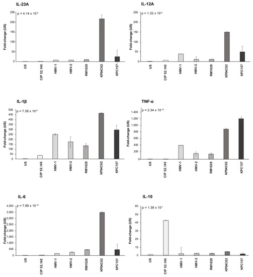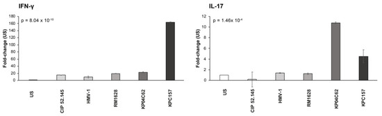 The histograms presented in Figure 2 show a more detailed graphical representation of the effects of each Kp strain on cytokine gene activation. It should be noted that the HMV non-virulent KP04C62 strain had similar behavior to the classical Kp strain, and both strains activated DCs to express cytokine genes involved in the TH17 (IL-23, IL-6, and IL-1β) and TH1 (IL-12 and TNF-α) responses (results of post hoc tests are reported in Supplementary Table S1).