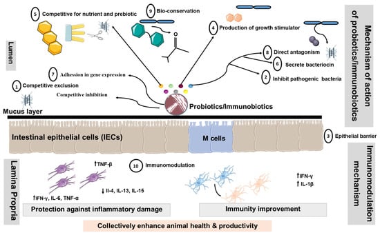 Therefore, this review brings forward a summary of recent scientific literature, as well as its implications in terms of animal health and productivity of the main species of farm animals, such as pigs, cattle, goats, and sheep. This review also explores the mechanism of actions of immunomodulation by probiotic LAB in intestinal epithelial cells (IECs) in in vitro animal model.