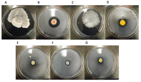 Isolates showing inhibition zones on a lawn of L. pneumophila (LpS256P) on CYE agar incubated at 30 °C for 4 days. Isolates are: (A) Bacillus amyloliquefaciens (SPF474), (B) Bacillus paralicheniformis (SPF497), (C) Bacillus subtilis (SPF437), (D) Chryseobacterium sp. (SPF475), (E) Cupriviadus sp. (SPF499), (F) Staphylococcus epidermidis (SPF476), and (G) Stenotrophomonas sp. (SPF498), identified by 16S rRNA and whole genome sequencing.