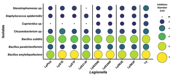 Inhibition zone diameters, in centimeter, produced by bacterial isolates on lawns of different strains of Legionella grown on CYE agar incubated at 30 °C for 4 days. The inhibition zone diameter is indicated by the size of the circle and by colour scale (from purple to yellow; NI: no inhibition).