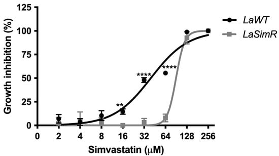 Leishmanicidal activity of simvastatin in the wild-type and simvastatin-resistant strains of L. amazonensis. Wild-type (LaWT) and simvastatin-resistant (LaSimR) promastigotes were incubated at an initial concentration of 1 × 106 promastigotes/mL in the presence of various concentrations of simvastatin (0–256 μM) in 96-well plates for 72 h at 26 °C. After incubation, the growth was evaluated using resazurin (alamarBlue®); after 4 h, the reaction was evaluated by fluorimetry (excitation at 560 nm and emission at 590 nm). The experiments were performed in triplicate and repeated three times. ** p < 0.01; **** p < 0.0001.