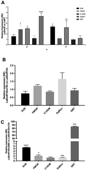 The sterol profile of LaSimR parasites cultured in the presence or in the absence of simvastatin was characterized by an increase in cholestane and stigmata-related sterols. SMT enables the biosynthesis of stigmata-related sterols; hence, we evaluated the levels of the transcripts of the SMT gene. Changes in mRNA levels encoding proteins involved in sterol biosynthesis, including HMGR, C14DM, squalene monooxygenase (SqMon), and SMT, in LaSimR parasites were evaluated and compared to those in the LaWT strain (Figure 2). The levels of the transcript of the Leishmania SUB-encoding gene were also analyzed.